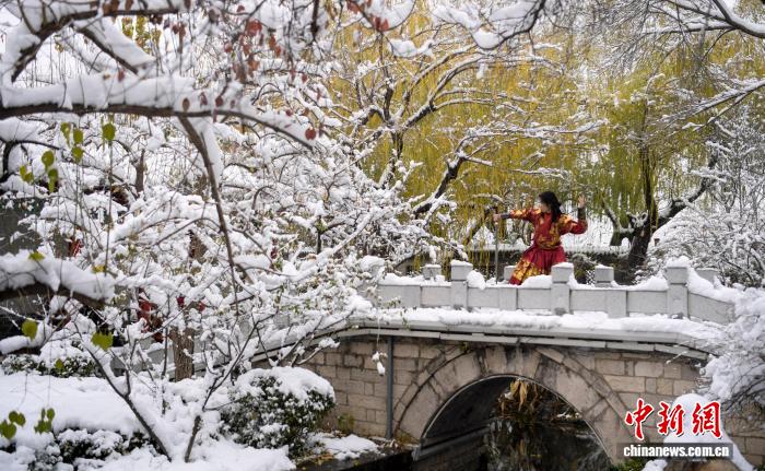 12月13日,济北年夜亮湖畔,市平易近正在雪景中舞剑。中新社记者 弛怯摄