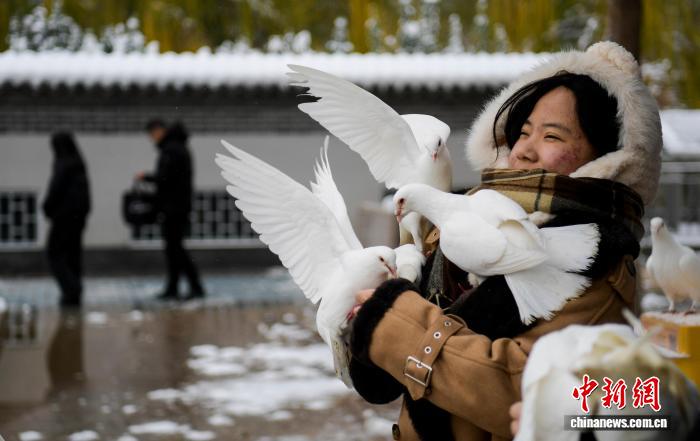 12月13日,济北泉乡广场,市平易近正在雪景中喂鸽子。中新社记者 弛怯摄